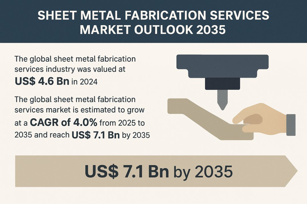 WILMINGTON, DE, UNITED STATES, September 30, 2025 /EINPresswire.com/ -- The global sheet metal fabrication services market is experiencing a dynamic phase of growth, driven by increasing industrial demand, technological advancements, and evolving material requirements. Valued at US$ 4.6 billion in 2024, the market is projected to expand at a CAGR of 4.0% between 2025 and 2035, reaching US$ 7.1 billion by 2035. This growth is reflective of the broader industrial landscape, where sheet metal components play a critical role across automotive, aerospace, construction, electronics, and renewable energy sectors. Analysts view this market as being shaped not only by traditional demand drivers but also by innovative automation technologies, sustainability initiatives, and global supply chain transformations.