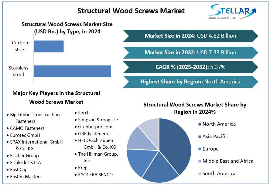 WILMINGTON, DE, UNITED STATES, October 13, 2025 /EINPresswire.com/ -- Explore the booming Structural Wood Screws Market, valued at USD 4.82 Bn in 2024, poised to reach USD 7.33 Bn by 2032 with 5.37% CAGR. Discover high-tensile, corrosion-resistant wood screws, industry trends, construction and furniture applications, and growth opportunities driving global demand for sustainable, high-performance fasteners.