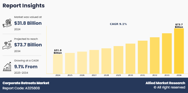 WILMINGTON, DE, UNITED STATES, October 16, 2025 /EINPresswire.com/ -- According to a new report published by Allied Market Research, titled, “Corporate Retreats Market," The corporate retreats market size was valued at $31.8 billion in 2024, and is estimated to reach $73.7 billion by 2034, growing at a CAGR of 9.1% from 2025 to 2034.